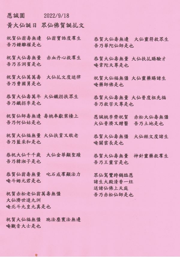 [20/08/2022] 更新 主頁 新增 「黃大仙師賀誕八仙乩文」及 壇內活動「壬寅年八月眾弟子恭賀大仙聖誕」